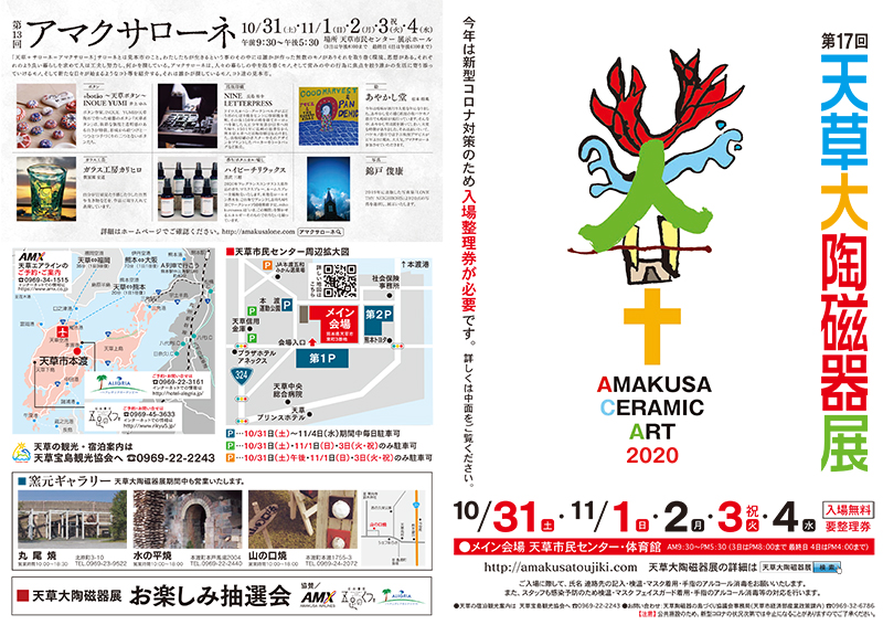 2020 |2008|2009|2010|2011|2012|2013|2014|2015|2016|2017|2018|2019|2020| 第13回 アマクサローネ 令和2年10月31日(土)〜4日(水) 出展者 01 +botão~天草ボタン~INOUE YUMI/井上 ゆみ ボタン 02 NINE LETTERPRESS/長島 裕介 活版印刷 03 あやかし堂/松本 将英 絵 04 ガラス工房カリヒロ/假屋園 宏道 ガラス工芸 05 ハイビーチリラックス/黒沢 三穂 香り/ボタニカル/癒し 06 錦戸 俊康 写真 ギャラリー